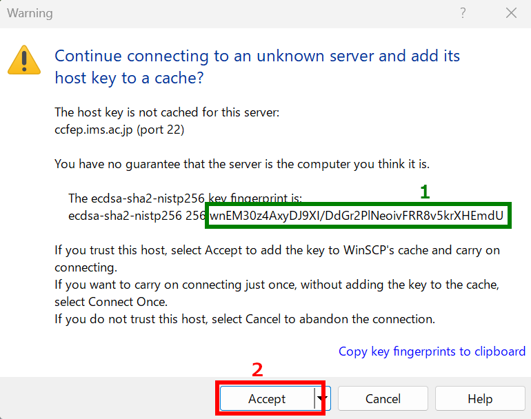 You may see warning window like above upon first connection. You need to verify the fingerprint of the server. The fingerprint must match either one in the following list. Then, click "Accept" to continue.