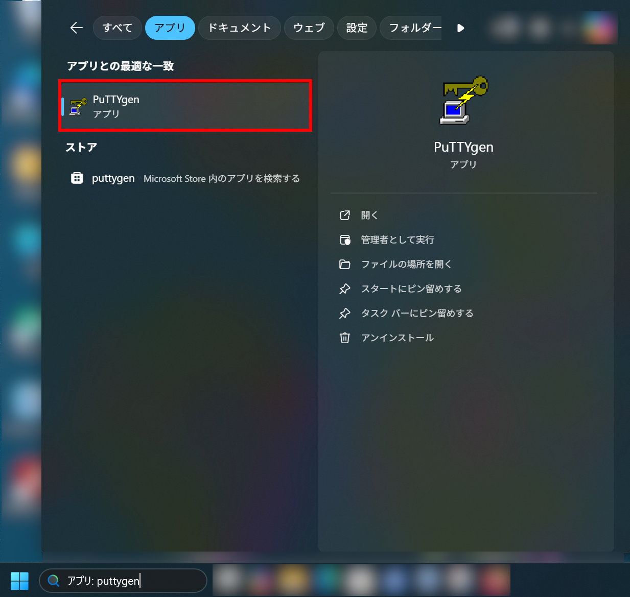 PuTTYgenは上の画像のように検索ボックス(Windows Search)から探すなどすれば起動できます。